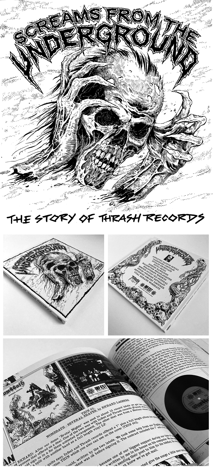 Book cover and logo illustrations for “Screams from the Underground,” a book about the history of legendary French underground metal label, Thrash Records. Authored and compiled by Dima Andreyuk. The book is currently available from the following distributors: