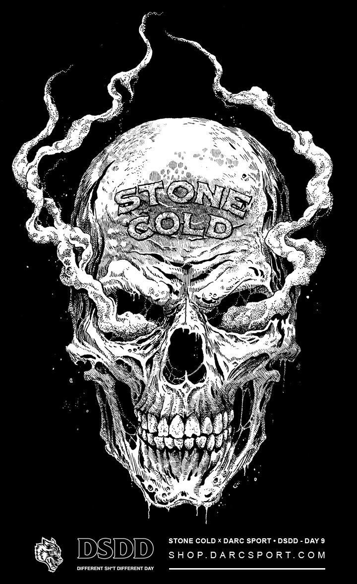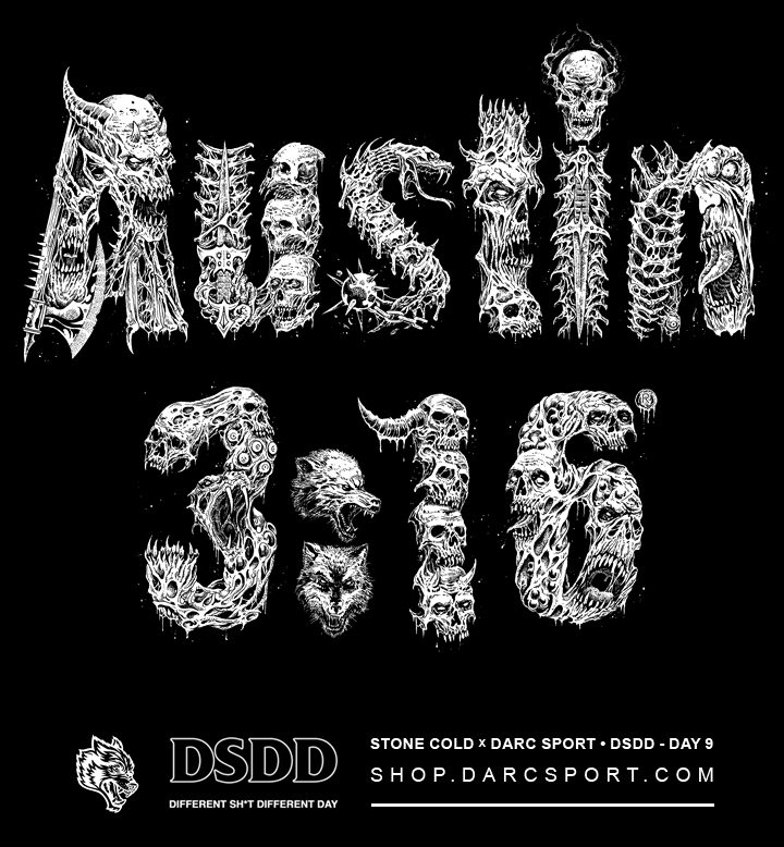 Official limited-edition STONE-COLD STEVE AUSTIN (WWE) x DARC SPORT merchandise illustrations, available this afternoon via DARC SPORT as part of their “DSDD” collection series.