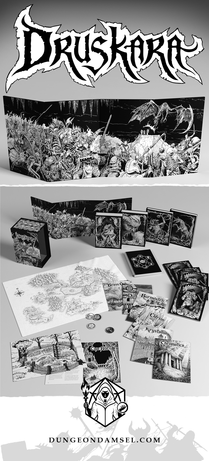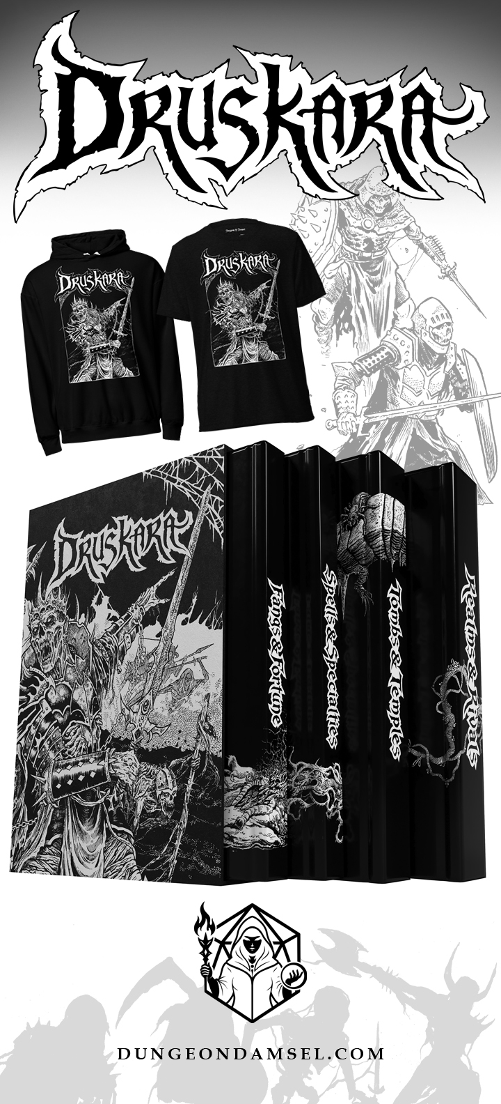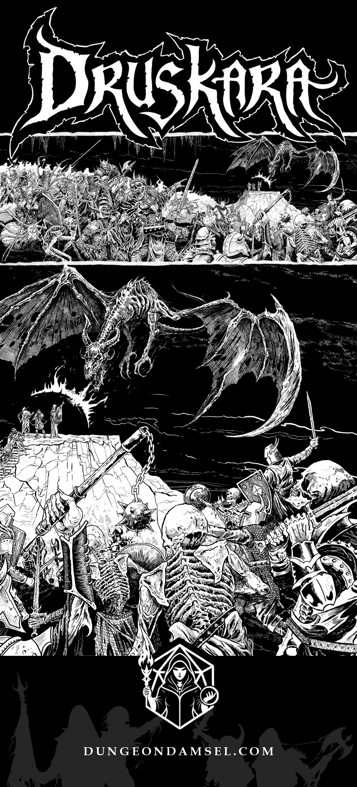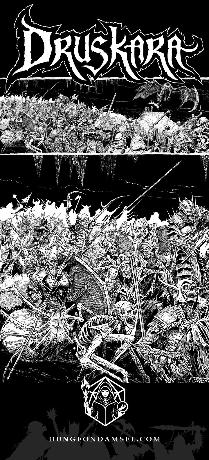 I’m pleased to share the logo, book slipcase, and dungeon master screen illustrations for DRUSKARA, a supplemental campaign for the SHADOWDARK roll playing game—published by Dungeon Damsel and funded by BackerKit.